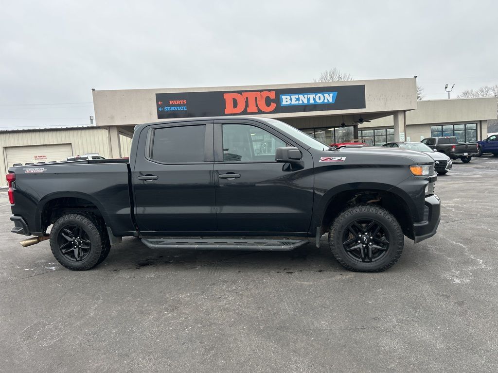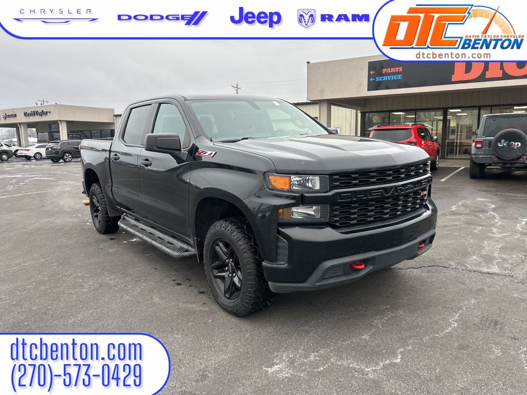Black 2019 Chevrolet Silverado 1500 Custom Trail Boss 4WD 6-Speed Automatic Electronic with Overdrive EcoTec3 4.3L V6 4D Crew Cab, 6-Speed Automatic Electronic with Overdrive, 4WD, Black Cloth, 170 Amp Alternator, 3.5" Diagonal Monochromatic Display, Apple CarPlay/Android Auto, Bluetooth® For Phone, Chevytec Spray-On Black Bedliner, Color-Keyed Carpeting Floor Covering, Deep-Tinted Glass, Electronic Cruise Control, Exterior Parking Camera Rear, Front Rubberized Vinyl Floor Mats, Fully automatic headlights, Heavy-Duty Rear Locking Differential, High Capacity Air Filter, High Gloss Black Grille, Hill Descent Control, Hitch Guidance, Locking Tailgate, Manual Tilt Wheel Steering Column, Performance Red Recovery Hooks, Power Door Locks, Power Front Windows w/Driver Express Up/Down, Power Front Windows w/Passenger Express Down, Power Rear Windows w/Express Down, Preferred Equipment Group 2CX, Rear 60/40 Folding Bench Seat (Folds Up), Rear Rubberized-Vinyl Floor Mats, Remote Keyless Entry, Suspension Package, Trailering Package.