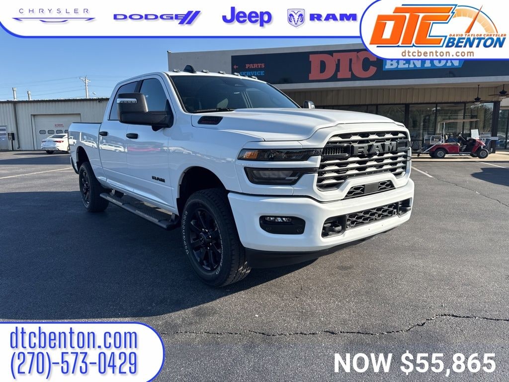 Bright White Clearcoat 2025 Ram 2500 Big Horn 4WD 8-Speed Automatic 6.4L V8 12" Touchscreen Display, 2 Way Rear Headrest Seat, 2nd Row In Floor Storage Bins, 4 Way Front Headrests, 40/20/40 Split Bench Seat, 4G LTE Wi-Fi Hot Spot, 9 Alpine Speakers w/Subwoofer, Air Conditioning ATC w/Dual Zone Control, Alexa Built-In, Anti-Spin Differential Rear Axle, Apple CarPlay, Auto Power-Folding Mirrors, Auto-Dimming Rear-View Mirror, Big Horn Level 1 Plus Equipment Group, Black Exterior Mirrors, Black Exterior Truck Badging, Black Interior Accents, Black Wheel Center Hub, Body Color Grille Surround, Connected Travel & Traffic Services, Connectivity - US/Canada, Dual Glove Boxes, Emergency Vehicle Alert System (EVAS), Exterior Mirrors Courtesy Lamps, Exterior Mirrors w/Heating Element, Exterior Mirrors w/Supplemental Signals, Foam Bottle Insert (Door Trim Panel), Folding Flat Load Floor Storage, Footwell Courtesy Lamp, Forward & Reverse Utility Lights, Front Armrest w/Cupholders, Front Center Seat Cushion Storage, Front Seat Back Map Pockets, Fully automatic headlights, Global Telematics Box Module (TBM), Gloss Black Nostrils/Mic Black Grille, Glove Box Lamp, Google Android Auto, GPS Antenna Input, GPS Navigation, HD Radio, Integrated Voice Command w/Bluetooth, LED Bed Lighting, Locking Lower Glove Box, Luxury Steering Wheel, Manual Adjust 4-Way Front Passenger Seat, Mirror Running Lights, MOPAR Deployable Bed Step, MOPAR Spray In Bedliner, Night Edition, Off-Road Info Pages, Painted Front Bumper, Painted Rear Bumper, Power 2-Way Driver Lumbar Adjust, Power Adjust 8-Way Driver Seat, Power Adjust Mirrors, Power Adjustable Convex Aux Mirrors, Power Heated Folding Telescopic Mirrors, Power Telescoping Mirrors, Premium Cloth 40/20/40 Bench Seat, Quick Order Package 2UZ Big Horn, Radio: Uconnect 5 Nav w/12.0" Display, Rear 60/40 Folding Seat, Rear Dome w/On/Off Switch Lamp, Remote Start System, Remote USB Port - Charge Only, Selectable Tire Fill Alert, SiriusXM Radio Service, SiriusXM w/360L, Steering Wheel Mounted Audio Controls, Storage Tray, Trailer Tow Pages, Wheels: 20" x 8.0" Black Painted Aluminum.